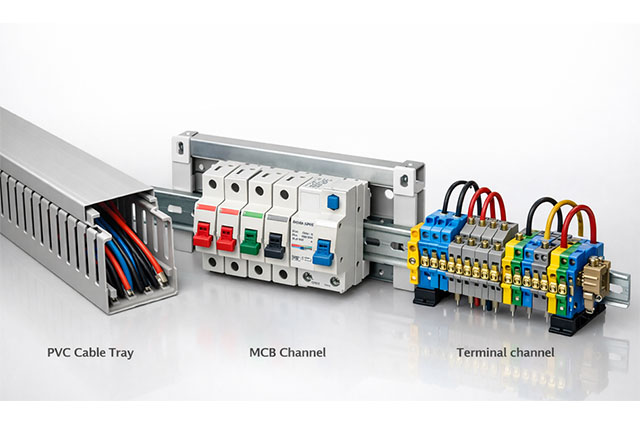 PVC Cable Tray, MCB Channel (DIN Rail) and Terminal Channel together form a complete wiring management and mounting system for electrical control panels.