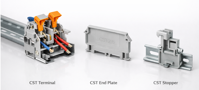 The CST terminal block provides secure connection of control and power wires, the CST end plate protects live parts at the end of the terminal row, and the CST stopper locks all terminals firmly on the DIN rail.