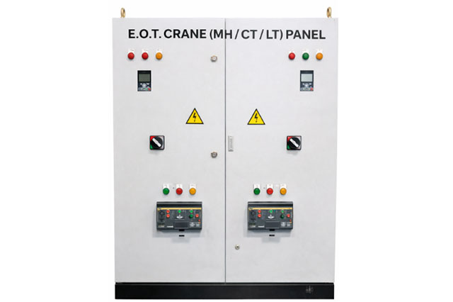An E.O.T. Crane Control Panel is designed to control and protect the three major crane motions – Main Hoist (MH), Cross Travel (CT), and Long Travel (LT).